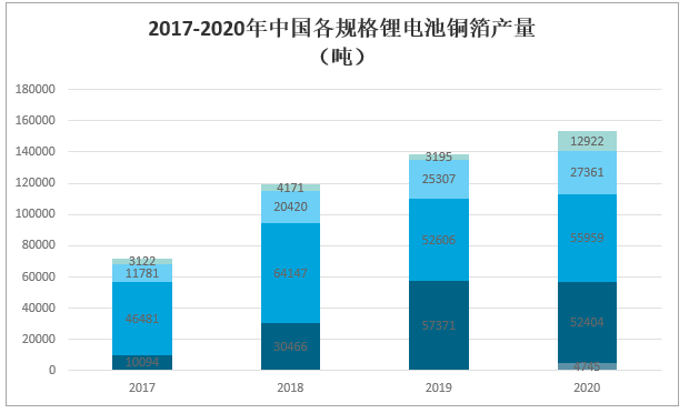 2017-2020年中國各規格鋰電池銅箔產量