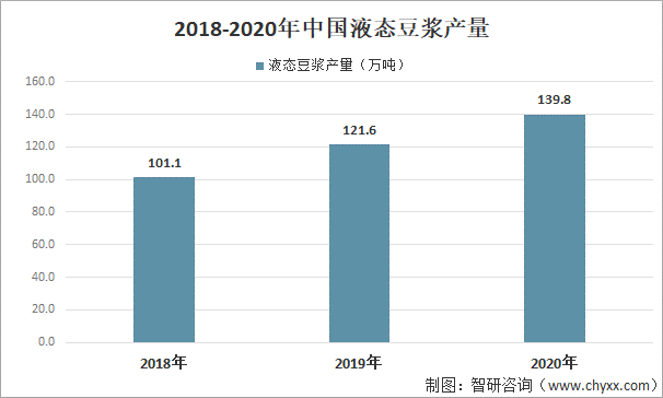 2019年中國液態(tài)豆?jié){產(chǎn)量為121.6萬噸,同比增長20.3%;2020年中國液態(tài)豆?jié){產(chǎn)量約為139.8萬噸。
