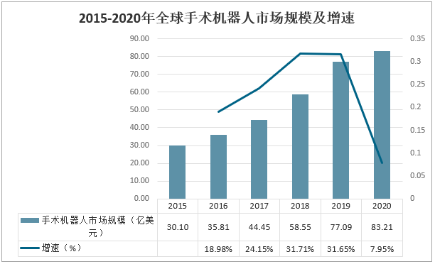 2015-2020年全球手術(shù)機器人市場規(guī)模及增速