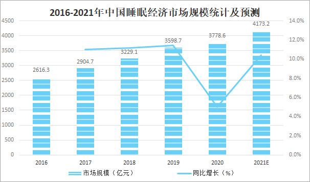 由于生活與工作壓力、手機和過量信息干擾等各種因素,一邊養生一邊熬夜這種矛盾現象成為了越來越多人們的選擇,給睡眠經濟帶來新的商機,我國睡眠經濟雖然起步較晚,但近年來行業發展進入快速期,2020年中國睡眠經濟市場規模達3778.6億元,較2019年增加了179.90億元,同比增長5.0%,預計2021年中國睡眠經濟市場規模將達到4173.2億元,預計未來隨著睡眠產品市場滲透率不斷提高,產品類型不斷增多,市場規模將繼續保持增長趨勢。