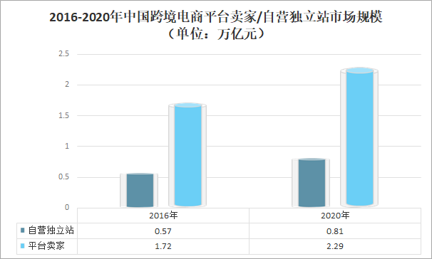 2016-2020年中國跨境電商平臺賣家/自營獨(dú)立站市場規(guī)模(單位:萬億元)