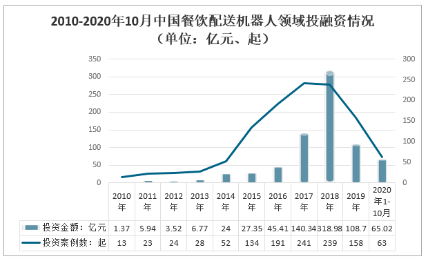 2010-2020年10月中國餐飲配送機器人領域投融資情況(單位:億元、起)