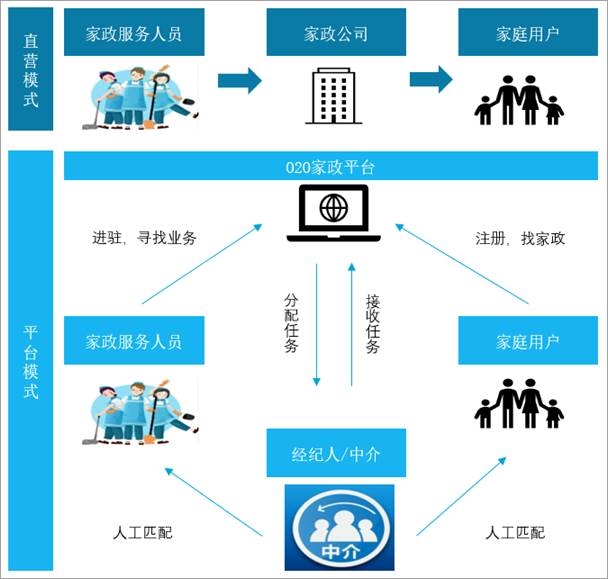 中國家政服務(wù)業(yè)傳統(tǒng)的商業(yè)模式是連鎖經(jīng)營,但隨著移動(dòng)互聯(lián)網(wǎng)和大數(shù)據(jù)等信息技術(shù)的發(fā)展和各路資本的涌入,家政服務(wù)市場規(guī)模不斷擴(kuò)大,出現(xiàn)了一批家政服務(wù)的創(chuàng)業(yè)公司,如51家庭管家、好慷在家和e家潔等。中國的家政服務(wù)業(yè)產(chǎn)業(yè)鏈根據(jù)其商業(yè)模式發(fā)生變化。在員工型模式下,上游為家政工具產(chǎn)品供應(yīng)商,中游為家政服務(wù)公司,下游為家庭用戶;在平臺(tái)型模式下,上游為家政工具產(chǎn)品供應(yīng)商和家政服務(wù)提供機(jī)構(gòu)或家庭服務(wù)員個(gè)人,中游為O2O平臺(tái),負(fù)責(zé)吸引家政服務(wù)提供者進(jìn)駐,下游為家庭客戶。