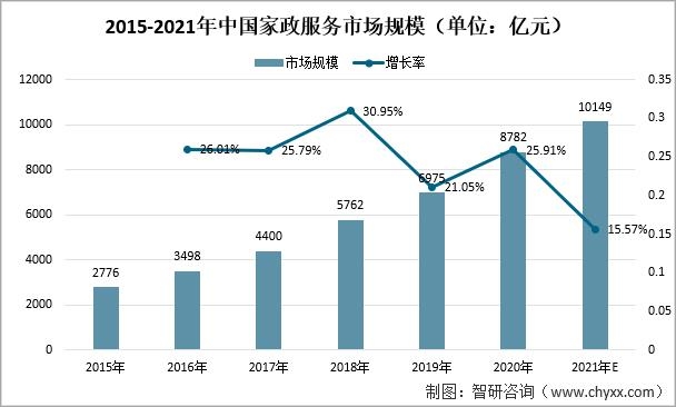 近年來,我國家政服務(wù)業(yè)迅猛發(fā)展,市場規(guī)模保持20%左右的增速。2020年我國家政服務(wù)市場規(guī)模為8782億元,同比2019年增漲了25.91%。