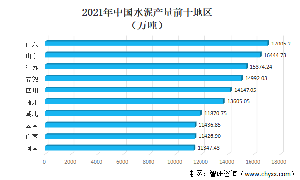 長期以來,水泥作為一種重要的膠凝材料,廣泛應用于土木建筑、水利、國防等工程。其中2021年中國水泥產量最多地區為廣東17005.2萬噸。2021年中國水泥產量前十地區