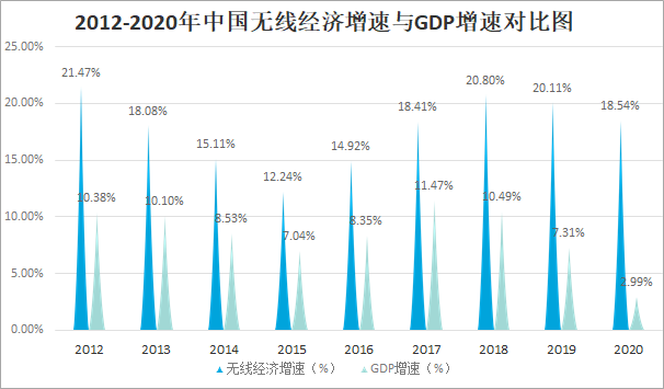 近年來無線技術應用的日趨廣泛,無線經濟將保持較快發展,成為我國經濟高質量發展的重要抓手之一,2020年中國無線經濟增速為18.54%,顯著高于同期GDP增速。