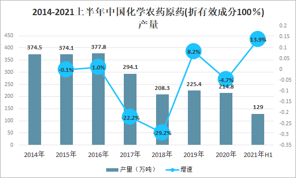 2014-2021上半年中國化學農藥原藥(折有效成分100%)產量