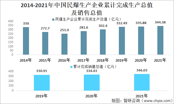 根據中國爆破器材行業協會數據:2021年中國民爆生產企業生產總值及銷售總值均有增長,生產總值達344.38億元,銷售總值為346.03億元。