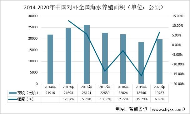 中國對蝦屬廣溫、廣鹽性、一年生暖水性大型洄游蝦類,主要生產于黃海和渤海。近年來中國對蝦養殖產業波動較大,2016-2019年間中國對蝦養殖面積呈下降趨勢,2019年的中國對蝦養殖面積為18546公頃,較2018年減少了3478公頃,同比減少15.79%。2020年中國對蝦養殖面積為19787公頃,較2019年增加了1241公頃,同比增加了6.69%。2014-2020年中國對蝦全國海水養殖面積(單位:公頃)