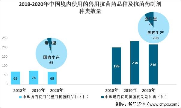 根據農業農村部數據:2020年中國使用的獸用抗菌藥品種共有68種,其中國內生產65種;使用的抗菌藥制劑共有216種,其中國內生產208種。