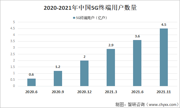 工信部數(shù)據(jù)顯示,5G終端用戶數(shù)量逐年增加,其中2021年11月中國5G終端用戶數(shù)量為4.5億戶。