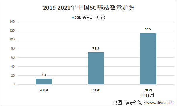 2019-2021年中國5G基站數(shù)量走勢