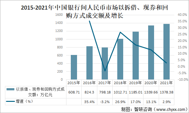 2015-2021年中國銀行間人民幣市場以拆借、現券和回購方式成交額及增長