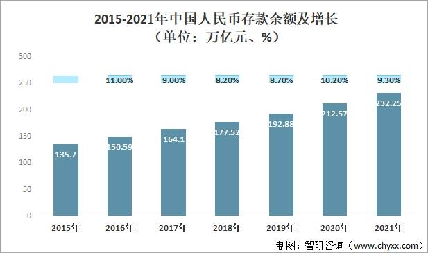 2015-2021年中國(guó)人民幣存款余額及增長(zhǎng)(單位:萬(wàn)億元、%)