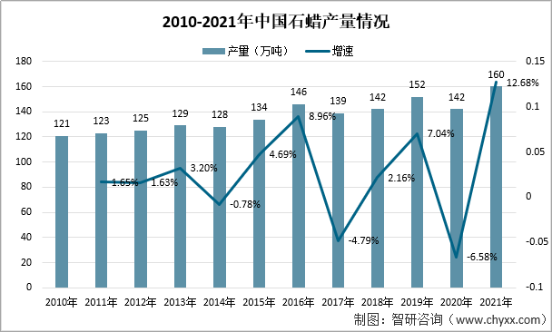 近年來,我國石蠟產業發展十分迅速,產量和市場規模都前所未有地發展壯大起來。根據數據顯示,2010-2021年中國石蠟產量整體上呈現上升趨勢,2021年國內石蠟總產量約為160萬噸,同比增漲12.68%。