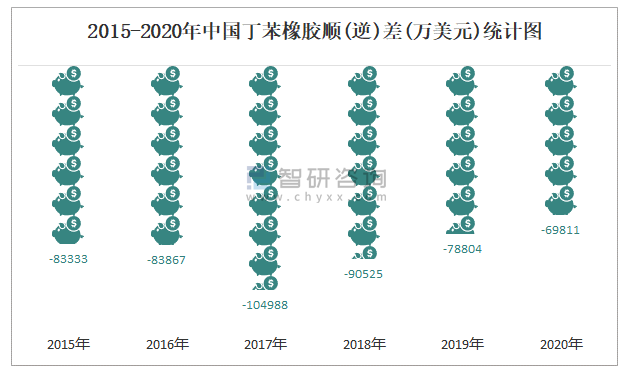 2015-2020年中國丁苯橡膠順(逆)差(萬美元)統計圖