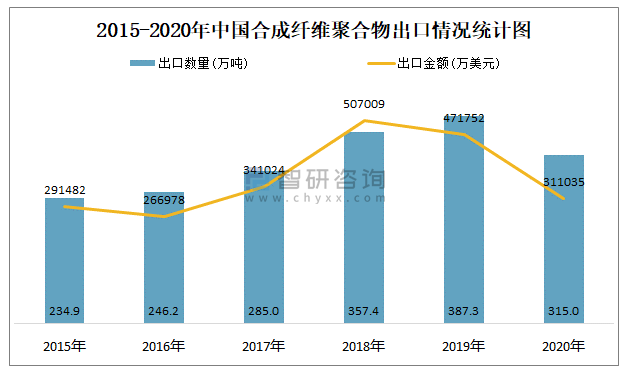 2015-2020年中國合成纖維聚合物出口情況統計圖