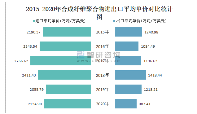 2015-2020年合成纖維聚合物進出口平均單價對比統計圖