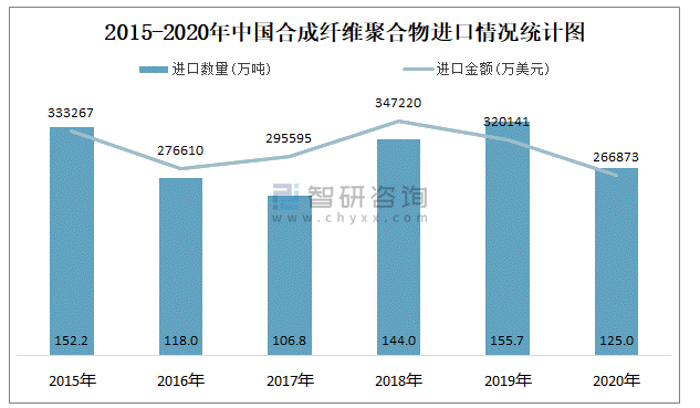 2015-2020年中國合成纖維聚合物進口情況統計圖