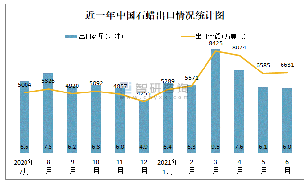 根據中國海關數據顯示:2021年6月中國石蠟進口數量為2.4萬噸,進口金額為2365萬美元;2021年6月石蠟出口數量為6萬噸,出口金額為6631萬美元;近一年中國石蠟出口總金額大于進口總金額,貿易順差為主,6月出口均價1105.2美元/噸。