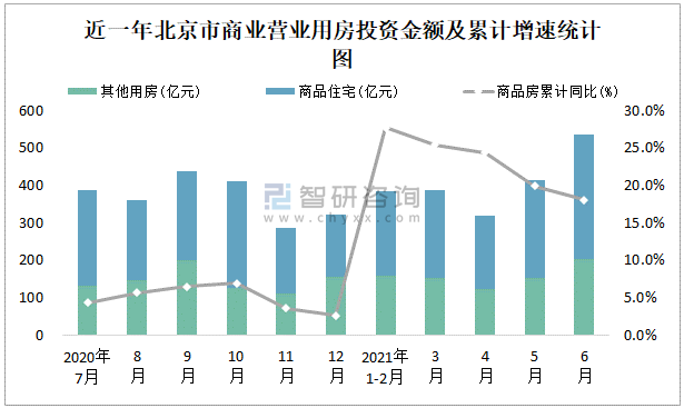 根據(jù)國家統(tǒng)計局?jǐn)?shù)據(jù)統(tǒng)計可知:2021年6月北京市房地產(chǎn)開發(fā)投資商品房投資金額為536.75億元,其中包括辦公樓、商業(yè)營業(yè)用房等其他用房204.81億元(注:辦公樓、商業(yè)營業(yè)用房未分開統(tǒng)計);2021年1-6月北京市房地產(chǎn)開發(fā)投資包括商業(yè)營業(yè)用房在內(nèi)的其他用房累計金額為792.95億元。