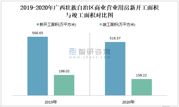 2019-2020年廣西壯族自治區商業營業用房新開工面積與竣工面積對比圖