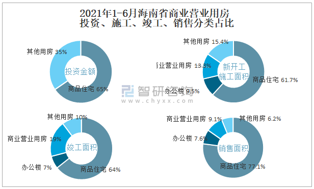 根據國家統計局數據統計可知:2021年1-6月海南省房地產開發企業在包括商業營業用房在內的其他用房投資金額占比為34.6%(注:只有投資金額中其他用房包含辦公樓、商業營業用房),商業營業用房的新開工面積與竣工面積所占比重差異不大,從銷售面積來看,商業營業用房銷售面積占比高于辦公樓銷售面積占比。