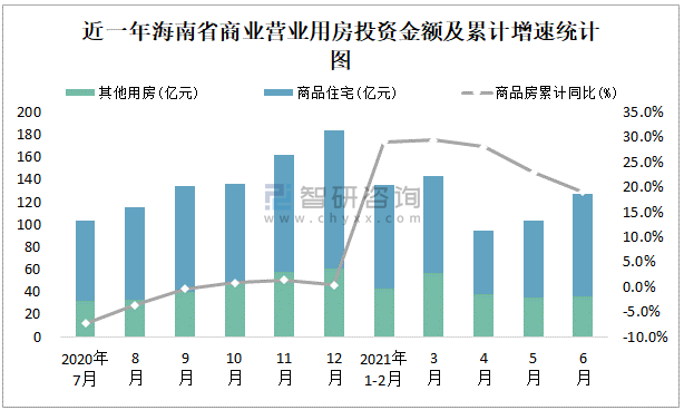 根據國家統計局數據統計可知:2021年6月海南省房地產開發投資商品房投資金額為127.46億元,其中包括辦公樓、商業營業用房等其他用房36.43億元(注:辦公樓、商業營業用房未分開統計);2021年1-6月海南省房地產開發投資包括商業營業用房在內的其他用房累計金額為208.87億元。