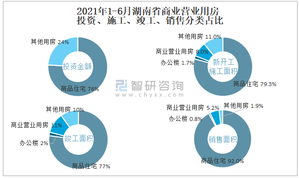 根據(jù)國家統(tǒng)計局數(shù)據(jù)統(tǒng)計可知:2021年1-6月湖南省房地產(chǎn)開發(fā)企業(yè)在包括商業(yè)營業(yè)用房在內(nèi)的其他用房投資金額占比為24.1%(注:只有投資金額中其他用房包含辦公樓、商業(yè)營業(yè)用房),商業(yè)營業(yè)用房的新開工面積與竣工面積所占比重差異不大,從銷售面積來看,商業(yè)營業(yè)用房銷售面積占比高于辦公樓銷售面積占比。