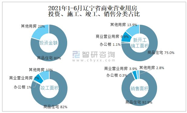 根據(jù)國(guó)家統(tǒng)計(jì)局?jǐn)?shù)據(jù)統(tǒng)計(jì)可知:2021年1-6月遼寧省房地產(chǎn)開(kāi)發(fā)企業(yè)在包括商業(yè)營(yíng)業(yè)用房在內(nèi)的其他用房投資金額占比為20.2%(注:只有投資金額中其他用房包含辦公樓、商業(yè)營(yíng)業(yè)用房),商業(yè)營(yíng)業(yè)用房的新開(kāi)工面積與竣工面積所占比重差異不大,從銷售面積來(lái)看,商業(yè)營(yíng)業(yè)用房銷售面積占比高于辦公樓銷售面積占比。