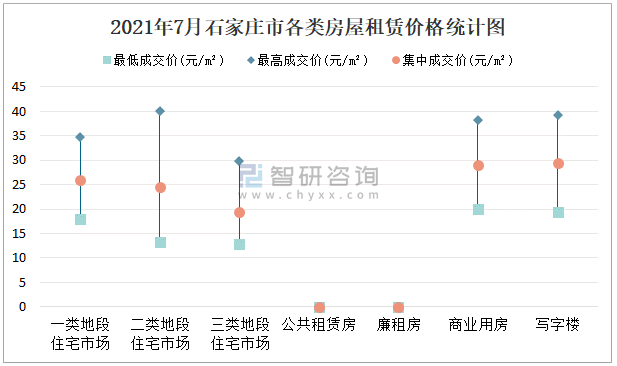 根據(jù)國(guó)信房地產(chǎn)信息網(wǎng)數(shù)據(jù)可知:2021年7月石家莊市7類(lèi)房屋中,公共租賃房、廉租房無(wú)統(tǒng)計(jì)數(shù)據(jù);寫(xiě)字樓租賃集中成交價(jià)最高,為29.35元/m²,二類(lèi)地段住宅市場(chǎng)租賃最高成交價(jià)最高,為40.01元/m²;三類(lèi)地段住宅市場(chǎng)租賃集中成交價(jià)約為19.31元/m²,寫(xiě)字樓租賃集中成交價(jià)高于商業(yè)用房。