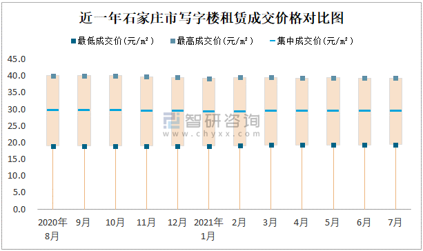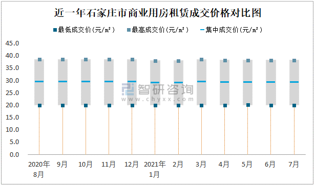 根據(jù)國(guó)信房地產(chǎn)信息網(wǎng)數(shù)據(jù)可知:近一年石家莊市商業(yè)用房租賃集中成交價(jià)在29元/m²-29.25元/m²之間波動(dòng),7月集中成交價(jià)為29.1元/m²;寫(xiě)字樓租賃集中成交價(jià)最高值為29.5元/m²,各月差異不明顯。