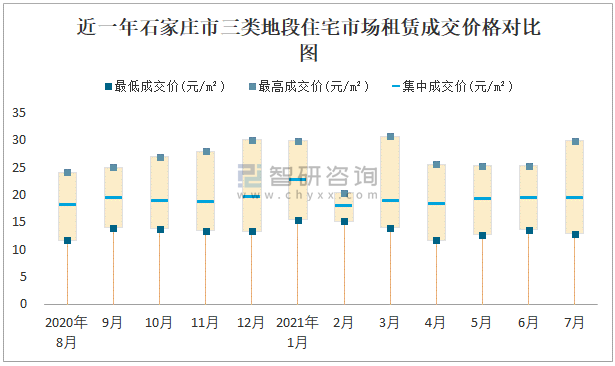 根據(jù)國(guó)信房地產(chǎn)信息網(wǎng)數(shù)據(jù)可知:近一年石家莊市一類(lèi)地段住宅市場(chǎng)租賃成交價(jià)格有一定幅度波動(dòng),7月最高成交價(jià)與最低成交價(jià)差距為16.74元/m²;近一年石家莊市二類(lèi)地段住宅市場(chǎng)租賃最低成交價(jià)與最高成交價(jià)的差距在15.57元/m²-30.31元/m²之間波動(dòng),今年3月差距達(dá)到最大;近一年三類(lèi)地段住宅市場(chǎng)租賃成交價(jià)格在11.7元/m²-30.66元/m²之間波動(dòng),7月集中成交價(jià)為19.31元/m²。