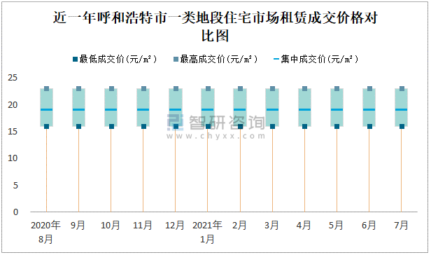 根據國信房地產信息網數據可知:近一年呼和浩特市一類地段住宅市場租賃成交價格有一定幅度波動,7月最高成交價與最低成交價差距為7元/m²;近一年呼和浩特市二類地段住宅市場租賃價格基本穩定在13元/m²-15元/m²之間;近一年三類地段住宅市場租賃成交價格在10元/m²-13元/m²之間波動,7月集中成交價為11.5元/m²。