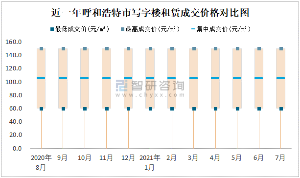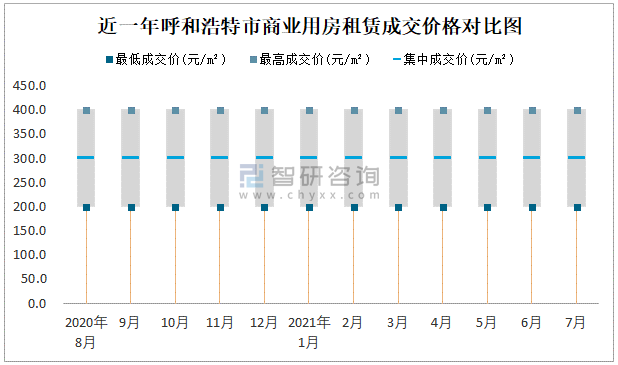 根據國信房地產信息網數據可知:近一年呼和浩特市商業用房租賃集中成交價基本穩定在300元/m²;寫字樓租賃集中成交價穩定在60元/m²-150元/m²之間波動,集中成交價穩定在105元/m²。