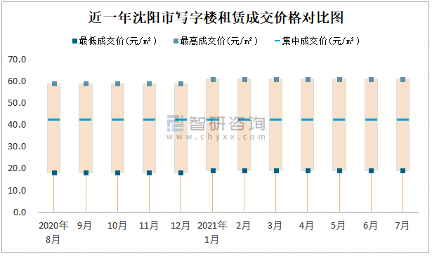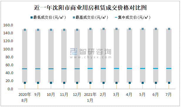 根據國信房地產信息網數據可知:近一年沈陽市商業用房租賃集中成交價相對穩定,7月集中成交價為51元/m²;寫字樓租賃集中成交價2020年8月達到最高值(42元/m²)。