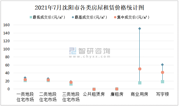 根據國信房地產信息網數據可知:2021年7月沈陽市7類房屋中,公共租賃房無統計數據,廉租房租賃集中成交價為0.5元/m²;商業用房租賃最高成交價均高于其他類房屋價格;一類地段住宅市場租賃最低成交價最高,為22元/m²;三類地段住宅市場租賃集中成交價約為17元/m²,商業用房租賃集中成交價高于寫字樓。