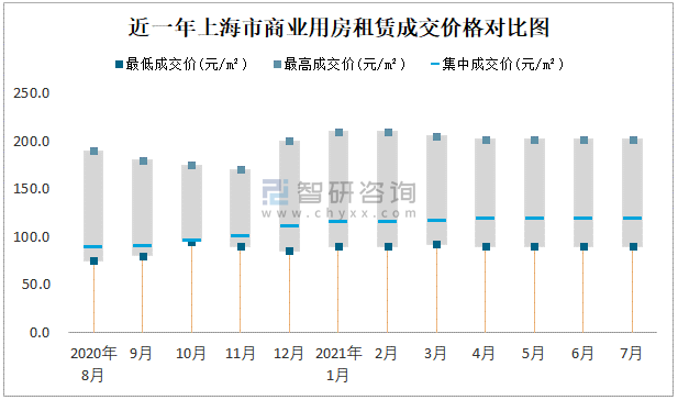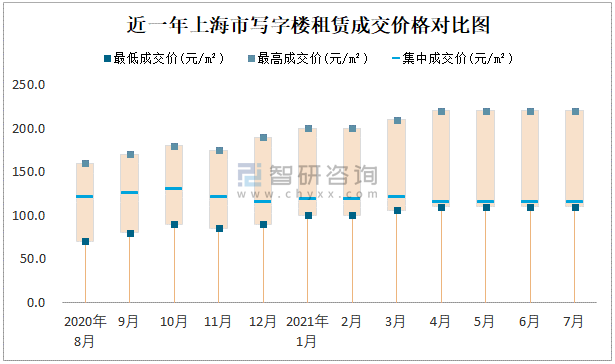 根據(jù)國信房地產(chǎn)信息網(wǎng)數(shù)據(jù)可知:近一年上海市商業(yè)用房租賃集中成交價在88元/m²-118元/m²之間波動,7月集中成交價為118元/m²;寫字樓租賃集中成交價2020年10月達到最高值(130元/m²)。