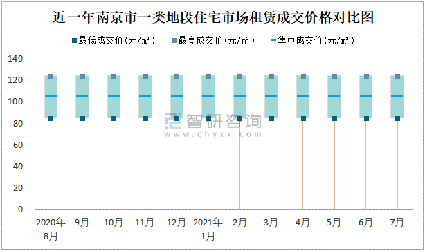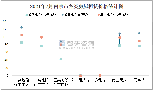 根據國信房地產信息網數據可知:2021年7月南京市7類房屋中,公共租賃房無統計數據,廉租房租賃集中成交價為0.69元/m²;一類地段住宅市場租賃最低成交價、最高成交價、集中成交價均高于其他類房屋價格;三類地段住宅市場租賃集中成交價約為79.8元/m²,商業用房租賃集中成交價高于寫字樓。