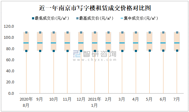 根據國信房地產信息網數據可知:近一年南京市商業用房租賃集中成交價比較穩定,在98.8元/m²-98.84元/m²之間波動,7月集中成交價為98.84元/m²;寫字樓租賃集中成交價今年6月達到最高值(89.63元/m²)。