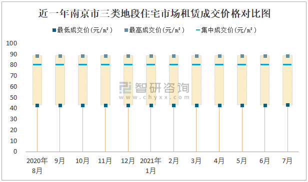 根據國信房地產信息網數據可知:近一年南京市一類地段住宅市場租賃成交價格有一定幅度波動,7月最高成交價與最低成交價差距為39.27元/m²;近一年南京市二類地段住宅市場租賃最低成交價與最高成交價的差距在21.78元/m²-22.05元/m²之間波動,2020年8月差距達到最大;近一年三類地段住宅市場租賃成交價格在42.95元/m²-88.42元/m²之間波動,7月集中成交價為79.8元/m²。