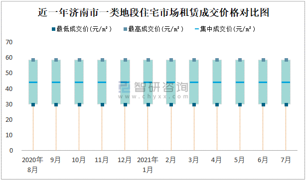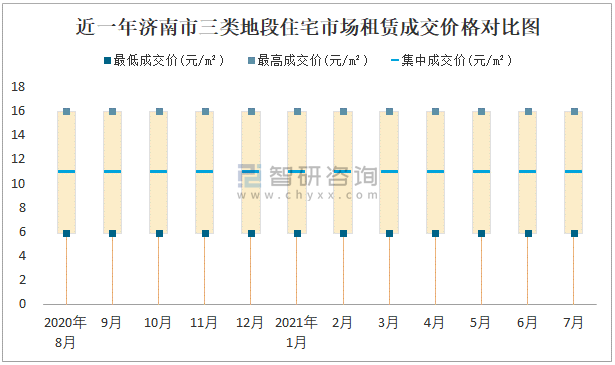 根據國信房地產信息網數據可知:近一年濟南市一類地段住宅市場租賃成交價格有一定幅度波動,7月最高成交價與最低成交價差距為28.83元/m²;近一年濟南市二類地段住宅市場租賃最低成交價與最高成交價的差距較穩定,在11.02元/m²-11.05元/m²之間波動,2020年8月差距達到最大;近一年三類地段住宅市場租賃成交價格在5.85元/m²-15.96元/m²之間波動,7月集中成交價為10.88元/m²。