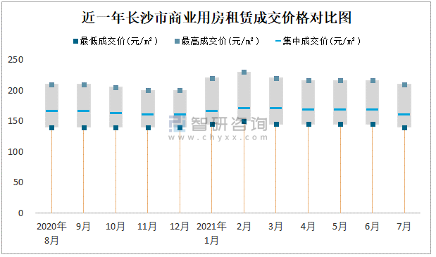 根據國信房地產信息網數據可知:近一年長沙市商業用房租賃集中成交價在160元/m²-170元/m²之間波動,7月集中成交價為160元/m²;寫字樓租賃集中成交價今年2月達到最高值(63元/m²)。