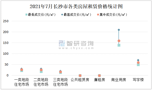 根據國信房地產信息網數據可知:2021年7月長沙市7類房屋中,公共租賃房、廉租房無統計數據;商業用房租賃最低成交價、最高成交價、集中成交價均高于其他類房屋價格;三類地段住宅市場租賃集中成交價約為17元/m²,寫字樓租賃集中成交價高于所有類型地段住宅市場租賃集中成交價。