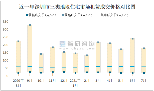 根據國信房地產信息網數據可知:近一年深圳市一類地段住宅市場租賃成交價格有一定幅度波動,7月最高成交價與最低成交價差距為209.5元/m²;近一年深圳市二類地段住宅市場租賃最低成交價與最高成交價的差距在189.3元/m²-341.41元/m²之間波動,今年3月差距達到最大;近一年三類地段住宅市場租賃成交價格在19.34元/m²-329.5元/m²之間波動,7月集中成交價為58.01元/m²。