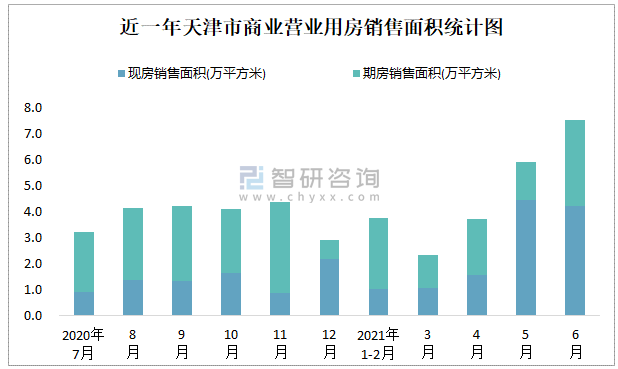 根據(jù)國家統(tǒng)計局?jǐn)?shù)據(jù)可知:2021年6月天津市商業(yè)營業(yè)用房銷售面積為7.52萬平方米(其中銷售現(xiàn)房4.22萬平方米,期房3.3萬平方米);2021年1-6月天津市商業(yè)營業(yè)用房累計銷售面積為23.26萬平方米;近一年天津市商業(yè)營業(yè)用房期房銷售面積遠(yuǎn)高于現(xiàn)房銷售面積。