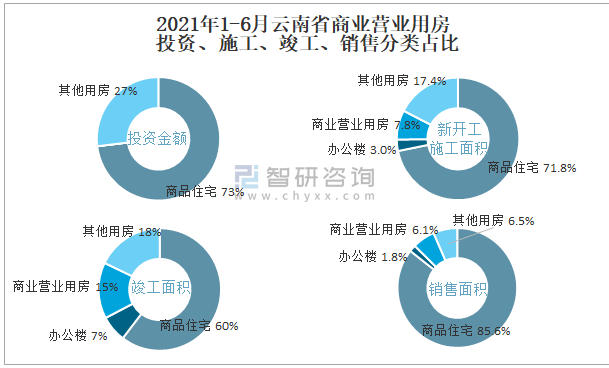 根據國家統計局數據統計可知:2021年1-6月重慶市房地產開發企業在包括商業營業用房在內的其他用房投資金額占比為25.4%(注:只有投資金額中其他用房包含辦公樓、商業營業用房),商業營業用房的新開工面積與竣工面積所占比重差異不大,從銷售面積來看,商業營業用房銷售面積占比高于辦公樓銷售面積占比。