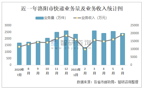 近一年洛陽市快遞業務量及業務收入統計圖