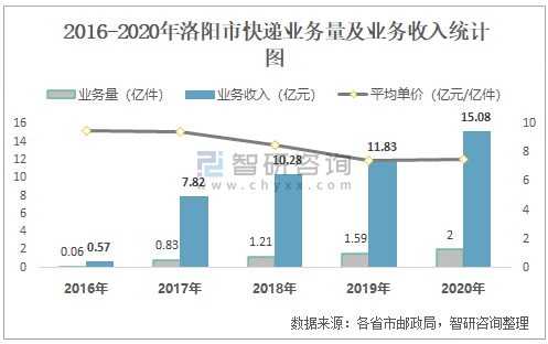 2016-2020年洛陽市快遞業務量及業務收入統計圖