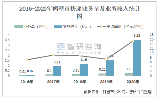 2016-2020年鶴壁市快遞業務量及業務收入統計圖